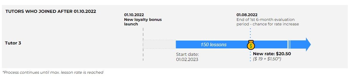 If you had busy months with less time for tutoring, you do not have to worry! Opposed to the old loyalty bonus system, the new one always gives you a fresh start at the beginning of each 6-month evaluation cycle to work towards a lesson rate increase.