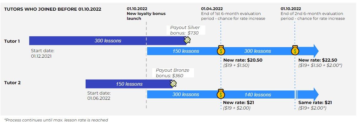 • Regardless of receiving the old bonus or not, tutors can work towards the lesson rate increase from October 1, 2022 onwards.