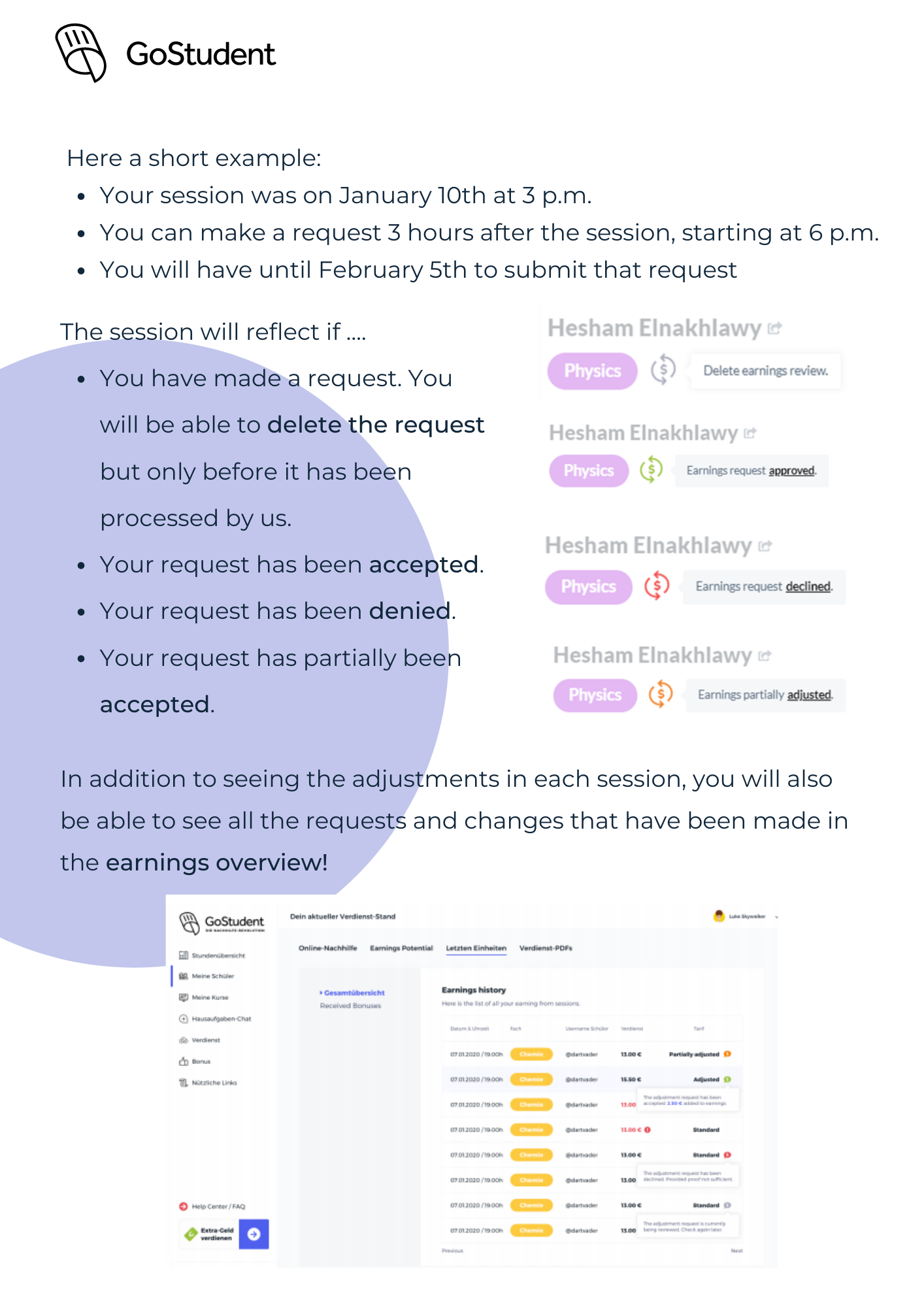 Once the request has been received, we will take care of the adjustment as soon as possible. The adjustment will be processed by the end of the month at the latest. You will then be able to read "Adjusted" under  your "Previous Session" in "Earnings" next to each unit.