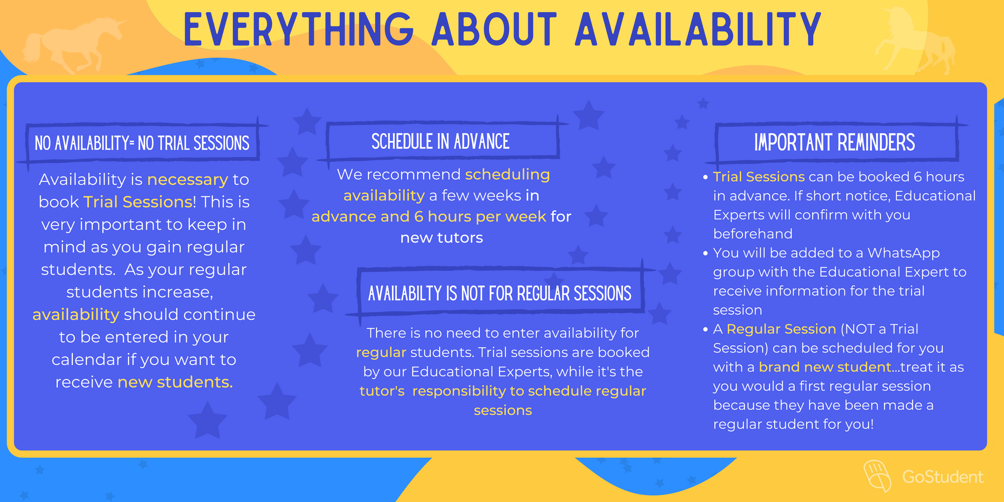- Don't forget to input availability in the WebApp for trial sessions (it doesn't carry over!). No availability = no trial sessions.